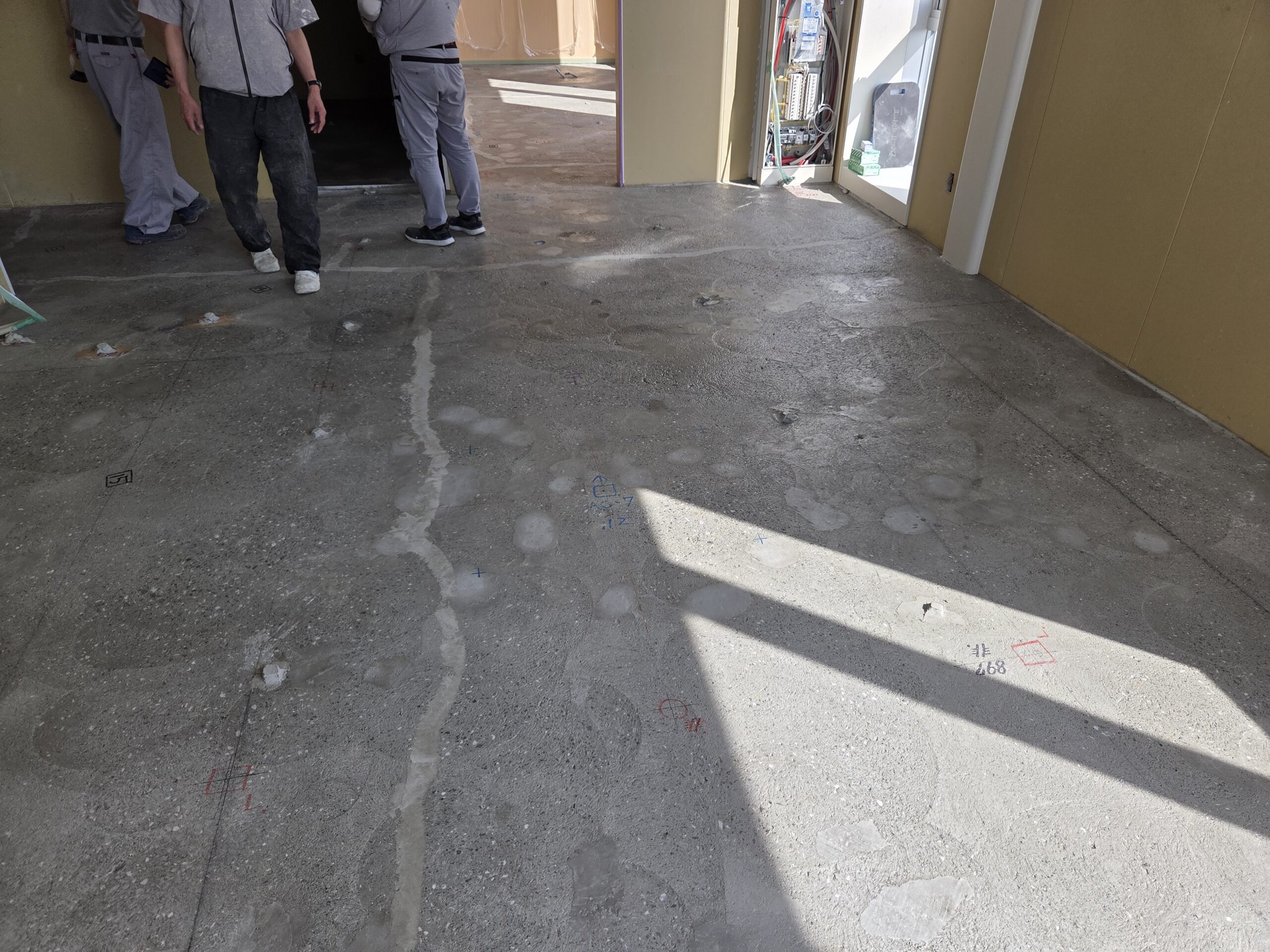 床仕上げ前の段階で、床面に段差や部分的な欠損が確認され、このままではがたつきが生じる恐れがある状態でした。